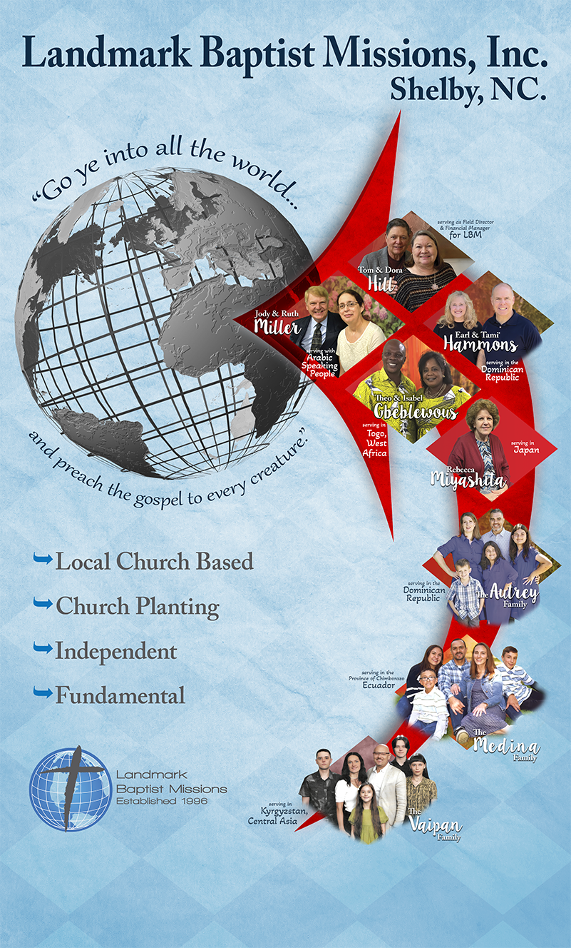 Landmark Baptist Missions, Inc. was established in January 1996 as an extension of Landmark Baptist Church. It is the commitment of LBM to provide ministry assistance, spiritual guidance, and financial accountability for missionaries reaching the lost and establishing indigenous, independent Baptist churches worldwide. LBM accepts like-minded missionaries who are called into mission service from within our church family or those who have a long association with Landmark’s missions program.